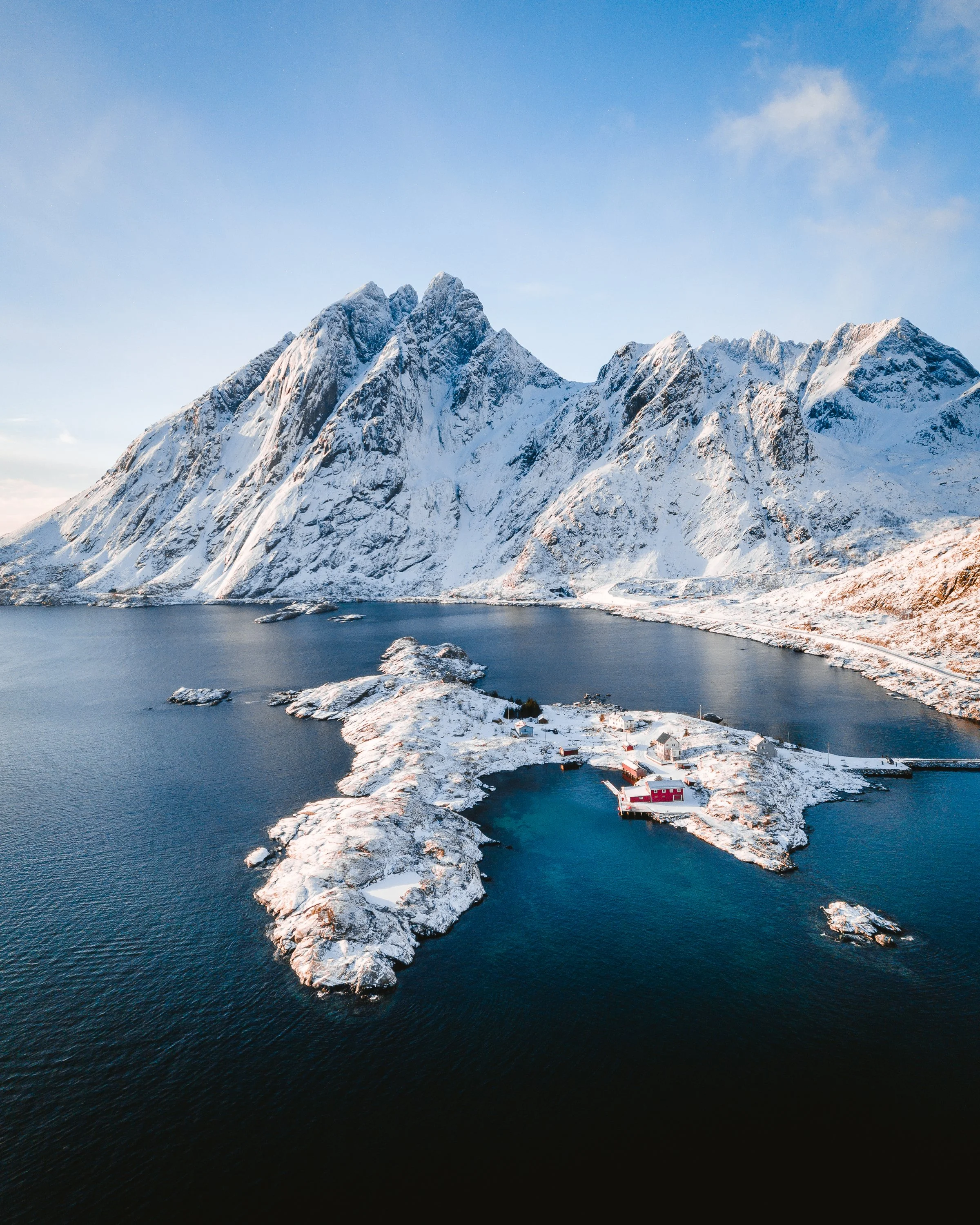 AERIAL VIEWS SHOW A TINY LITTLE RED CABIN BELOW, IN LOFOTEN ISLANDS, NORWAY.